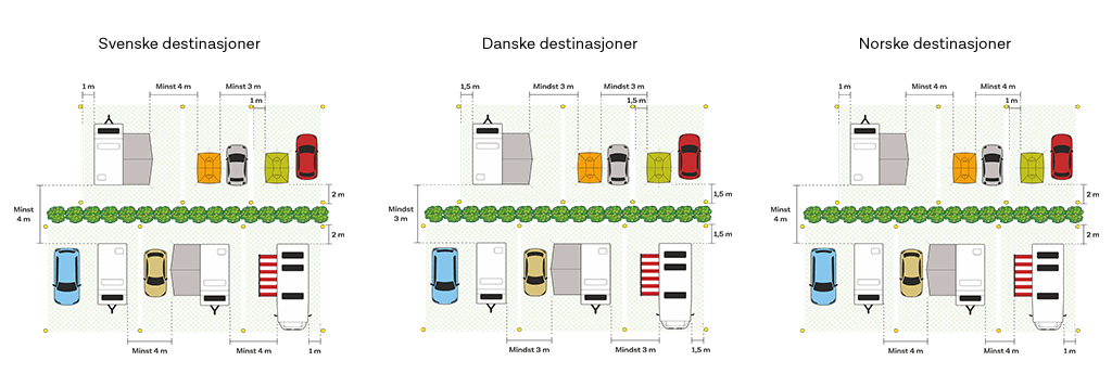 - Campingkjøretøy må oppstilles på en plass som er leid i forveien og, som vist på bildet nedenfor, for å følge den brannvernforskriften som gjelder for oss (med mindre annet angis på stedet). Hvis du er usikker på noe, kontakt medarbeiderne våre, så hjelper de deg.