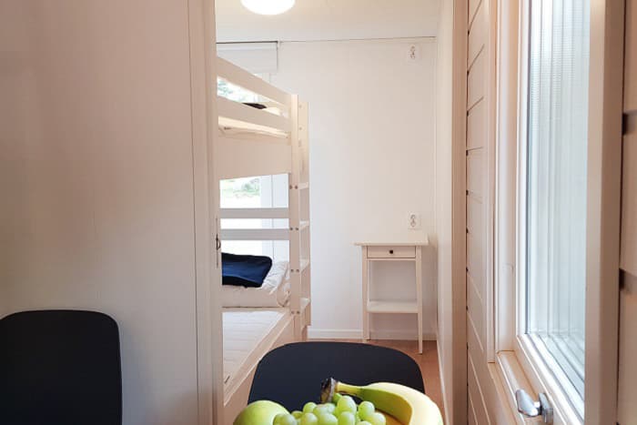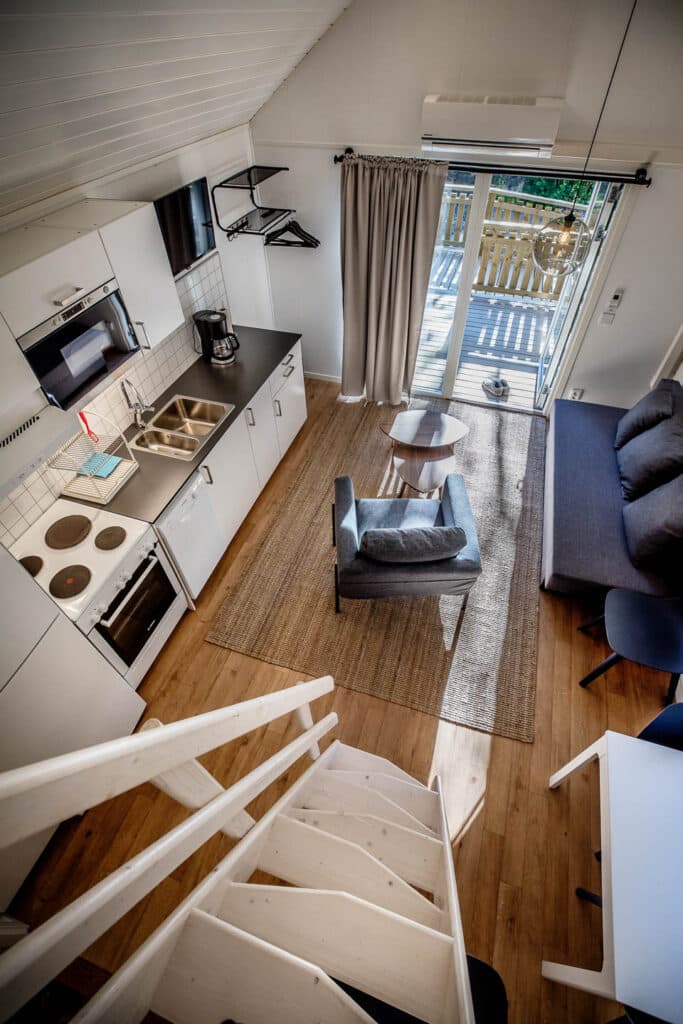 Skarpnäckstuga Plus är vår tillgänglighetsvänlig stuga med plats för upp till 6 personer. Här finns en ramp upp för altanen, ett större badrum med bredare ingång samt att ena sovrummet består av en våningssäng för att mer utrymme ska finnas. Resterande bäddar är fördelade på loftet med två enkelsängar samt en bäddsoffa i allrummet med plats för två personer. Skarpnäckstuga Plus är en modern och mysig stuga på 25 kvm och här finns allt du kan tänka dig under din semester. Ett modernt badrum med både dusch och toalett, ett allrum och kök som är utrustat med kyl, frys, diskmaskin, micro, spis, ugn och kaffebryggare. Allt för att du ska kunna laga en god måltid tillsammans med nära och kära under semestern.