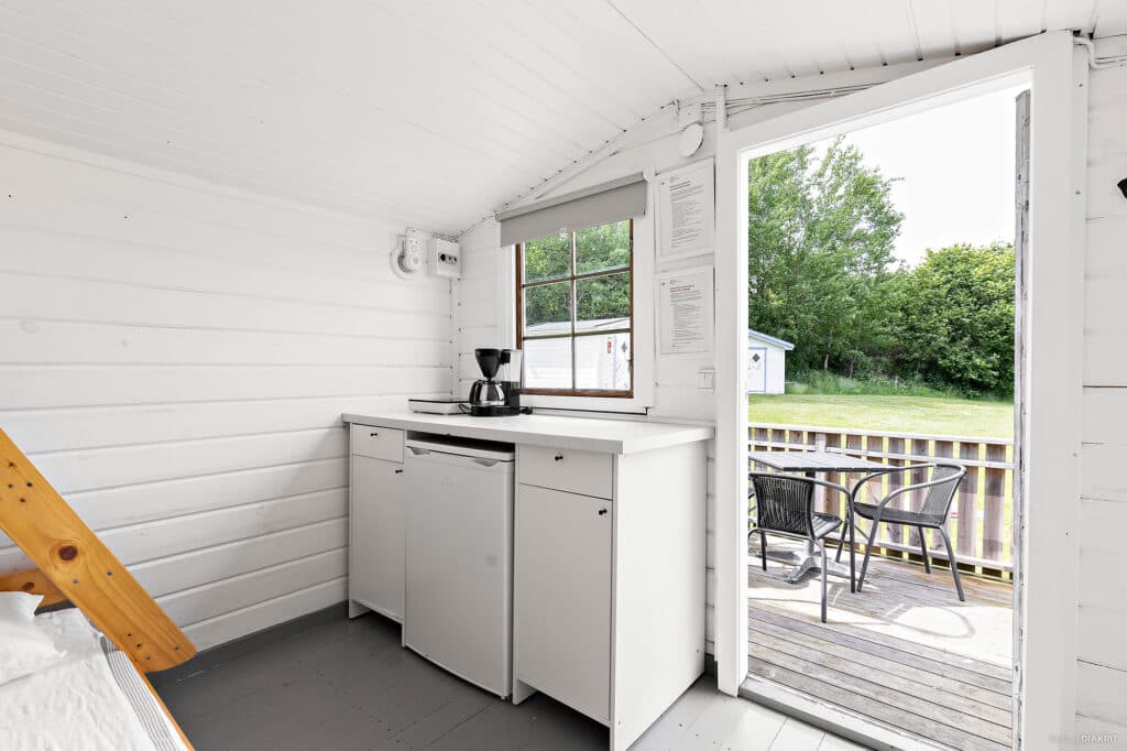 Dalatorp-hyttene har også en liten terrasse utenfor døren hvor du kan nyte morgenkaffen og omgivelsene på campingområdet.