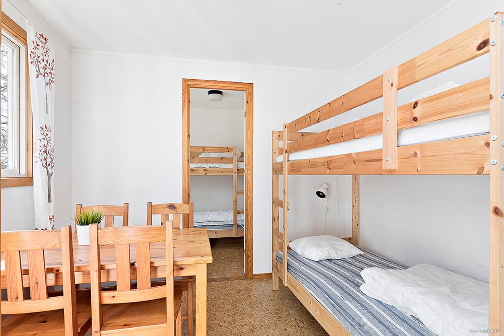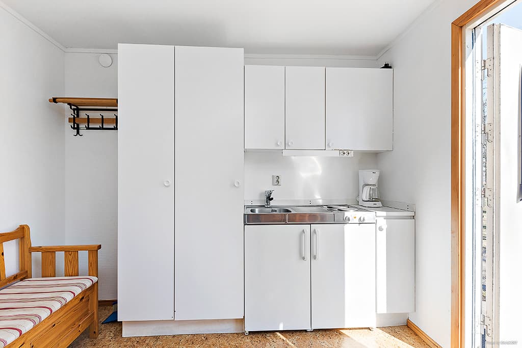 Hytta har et separat soverom med en køyeseng, samt en køyeseng i oppholdsrommet. Det finnes et enkelt kjøkken utstyrt med kokeplate, kjøleskap, kaffetrakter, mikrobølgeovn og enkelt kjøkkenutstyr, samt innlagt kaldt vann. Nyt måltidene rundt spisebordet med fire stoler. Dusj, toalett og kjøkken finnes i servicebygget på området, som ligger i nærheten av hytta. Her bor du også nær stranden og har fine utsikter.