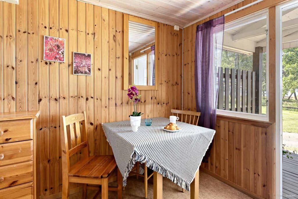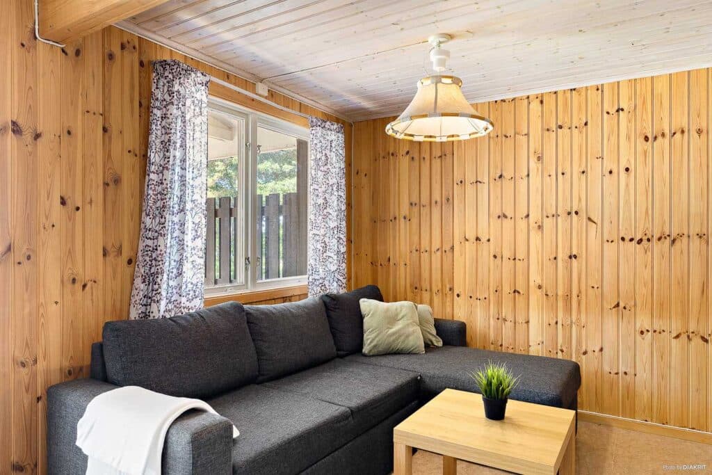 Sengeplassene i oppholdsrommet består av en køyeseng og en sovesofa for to personer. Hytta har også et kjøkken/kjøkkenkrok utstyrt med kokeplate, kjøleskap, kaffetrakter, vannkoker, mikrobølgeovn og enkelt kjøkkenutstyr. Det er innlagt kaldt vann i hytta. Dusj og toalett finnes i servicebygget på området. Her bor du nær både strand og servicebygg. Utenfor hytta finnes en koselig terrasse med benk og bord – perfekt for å nyte morgenkaffen utendørs.