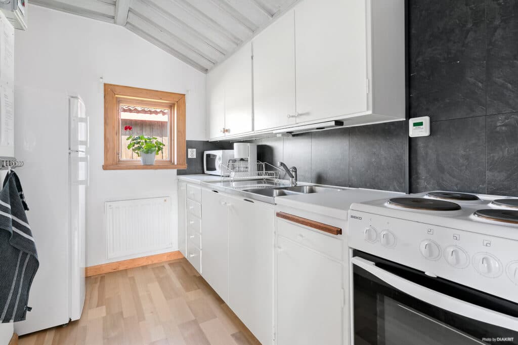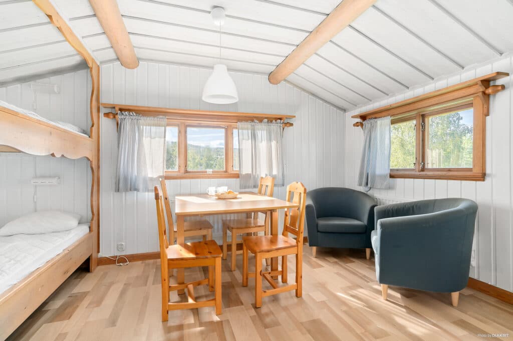 Backastuga er 24 m2 og har et separat soverom med køyeseng og felles stue og kjøkken. Stuen har sofa, peis og TV samt køyeseng. Tepper og puter er inkludert til alle senger i hytta. Kjøkkenområde med komfyr, stekeovn, mikrobølgeovn, vifte, kjøleskap, fryser og kaffetrakter. Det er toalett, men ingen dusj i hytta. Den kan brukes i servicebygningene på campingplassen. Motorvarmeruttak er tilgjengelig for hytta.