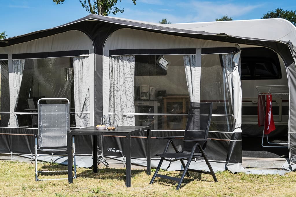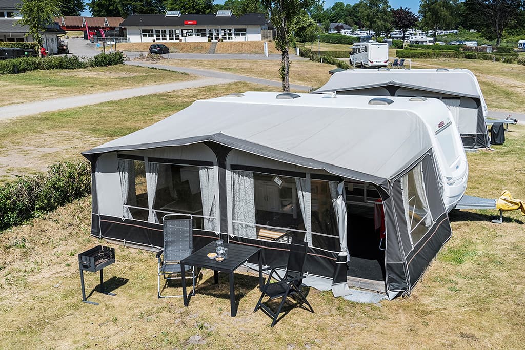 Telt: I markisen er det et spiseområde, kjøleskap/fryser.