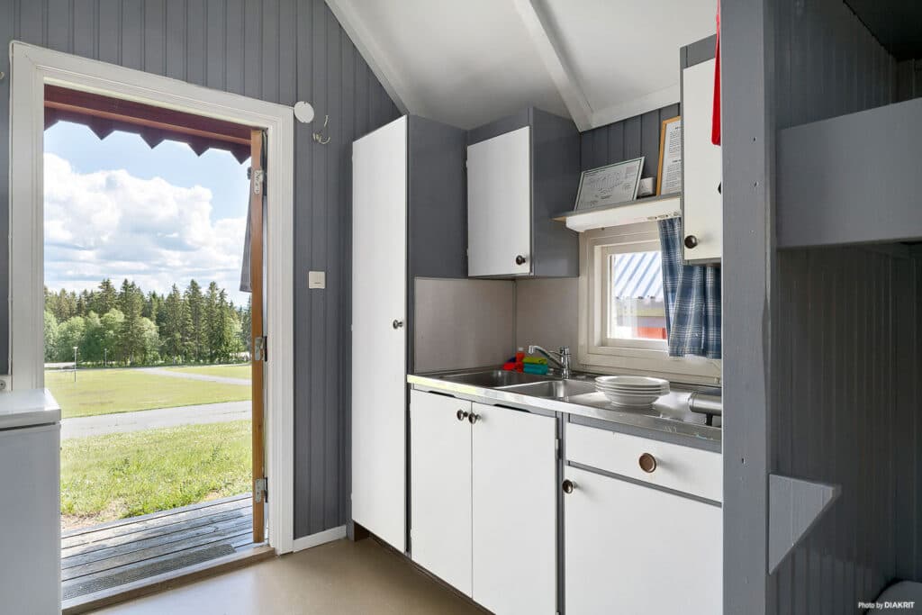 I det nærliggende servicebygget har du tilgang til kjøkken hvor du kan lage mat. Deretter kan du nyte måltidet i hytta ved spiseplassen for 4 personer. Rett utenfor døren finner du en liten veranda med fastmonterte benker på hver side, hvor du kan nyte omgivelsene og den rolige atmosfæren.