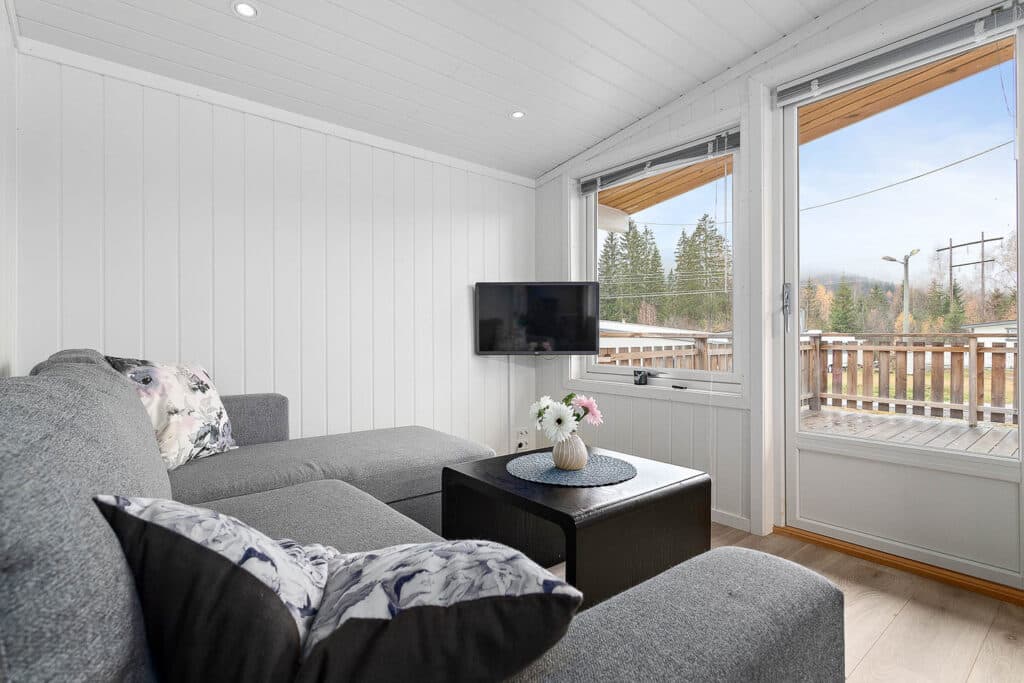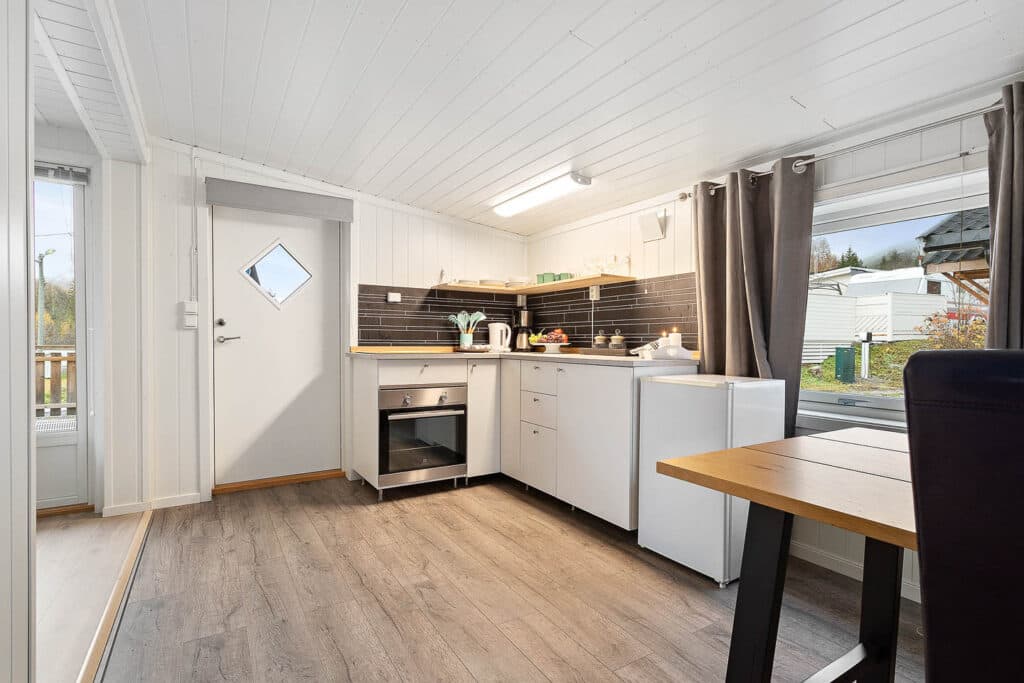 Vær oppmerksom på at hytta ikke har innlagt vann. Fasiliteter som kjøkken dusj og toalett finnes i nærliggende servicehus på området.