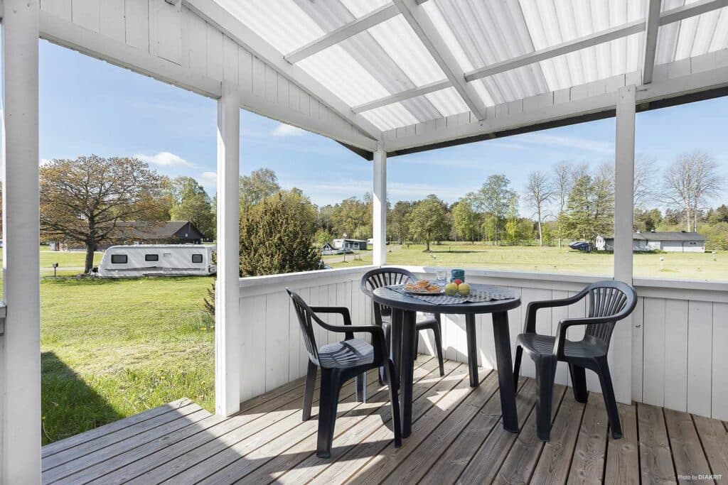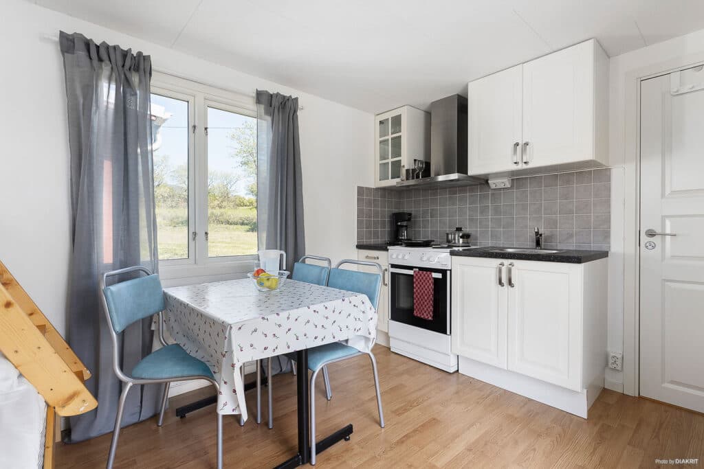 Liten och mysig stuga med alla viktiga detaljer. Våningssäng med 140cm bred underslaf och 80cm bred överslaf. Kuddar och täcken finns i stugan. Fullutrustat kök, här finns kyl och frys, spis med ugn, mikro samt kaffebryggare. Egen WC med dusch. Veranda under tak med enklare utemöbler för sköna sommarkvällar.