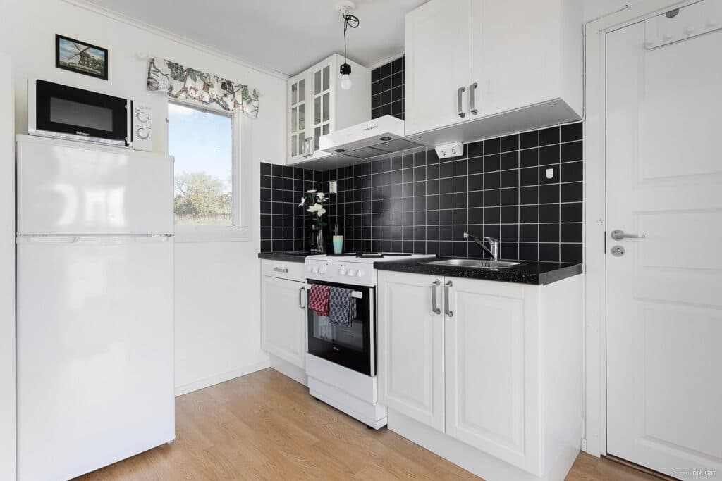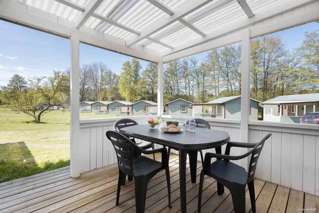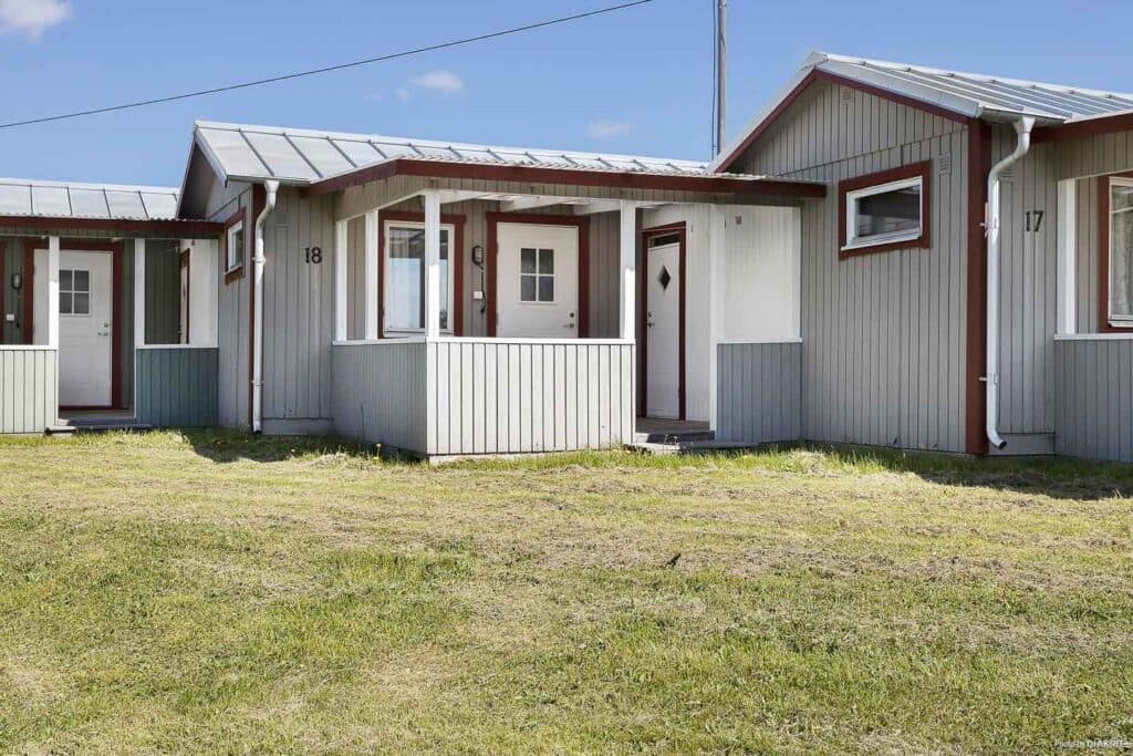 Liten och mysig 4-bäddstuga med alla viktiga detaljer. Stugan finns i två olika utföranden. Stugorna 3, 10, 13, 15, 21, 24, 25 och 26 är utrustade med en våningssäng och en bäddsoffa. Resterande stugor har två våningssängar. Kuddar och täcken finns i stugan. Fullutrustat kök, här finns kyl och frys, spis med ugn, mikro samt kaffebryggare. Badrum med dusch och toalett. Veranda under tak med enklare utemöbler för sköna sommarkvällar.