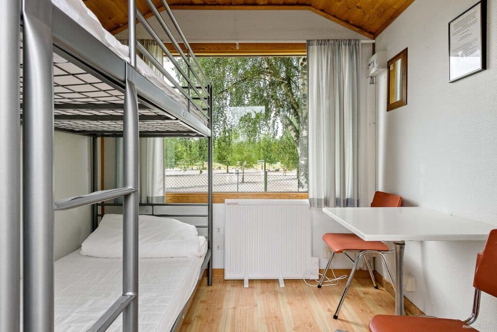 Ser du etter et mindre og enklere overnattingssted? Da er VM-Hytterna et godt valg for deg! Lugnets hytter ligger inne på campingområdet, og hver hytte har et areal på 5 m². Hytta har 2 køyesenger hvor du kan nyte en god natts søvn, samt et bord og to stoler. Omtrent 100 meter fra overnattingsstedet ligger campingplassens servicebygning hvor du har tilgang til dusj og toalett. Det er totalt 10 hytter, og firbeinte venner er også velkomne her! VM-Hytterna er derfor det perfekte overnattingsstedet for de som ønsker å bo litt mindre, enklere og nær fasiliteter.