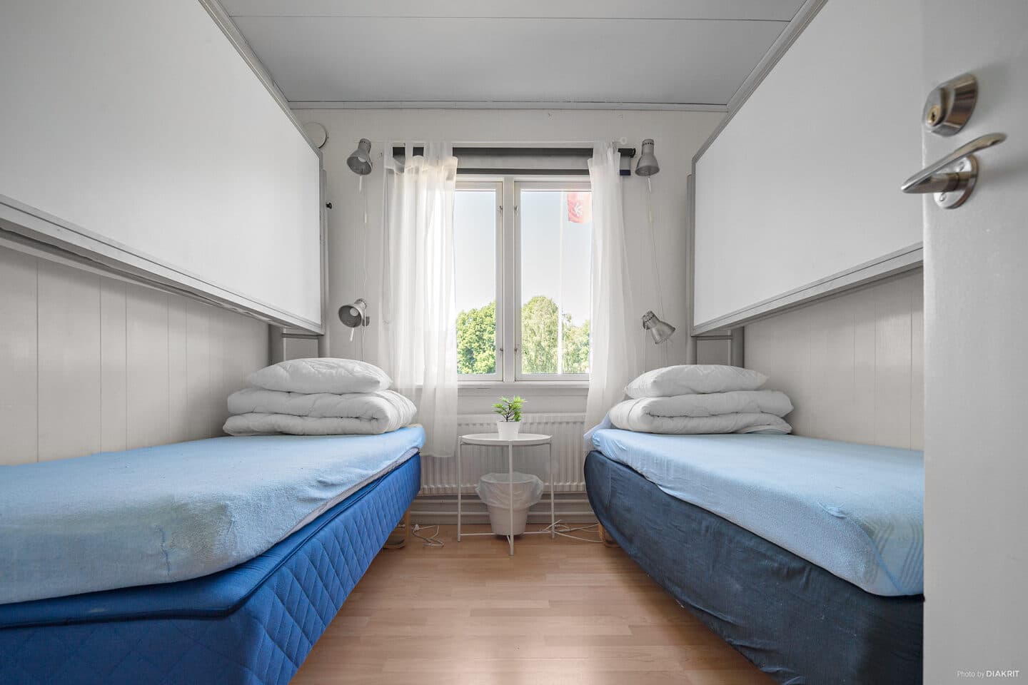 Rum för upp till fyra personer. I rummen finns enkelsängar där de två översta sängarna är väggfasta och går att fälla upp mot väggen.