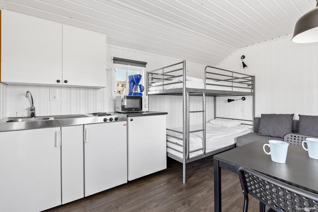 Våra Norastugor har en trevlig yta på 17 kvm och här finns plats för upp till 4 personer, där bäddarna är fördelade i en våningssäng samt i en bäddsoffa som rymmer 2 personer. Stuga 1, 2 och 5 har två våningssängar. Stuga 12 och 13 har en våningssäng och en bäddsoffa. Stugan är utrustad med trinettkök där du hittar både porslin, mikro, kyl, frys och kaffebryggare. Kylskåpet i stuga Nr. 1 och 5 är något mindre än i de övriga stugorna. Njut av måltiderna runt matbordet och de fyra stolarna som finns i allrummet. Vänligen notera att WC finns i stugan, men ej dusch. Vill du ha tillgång till dusch finns det i servicehuset som ligger i närhet av stugorna.