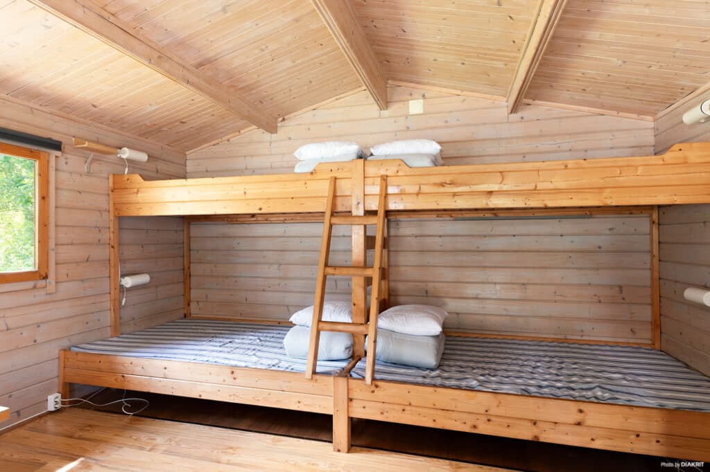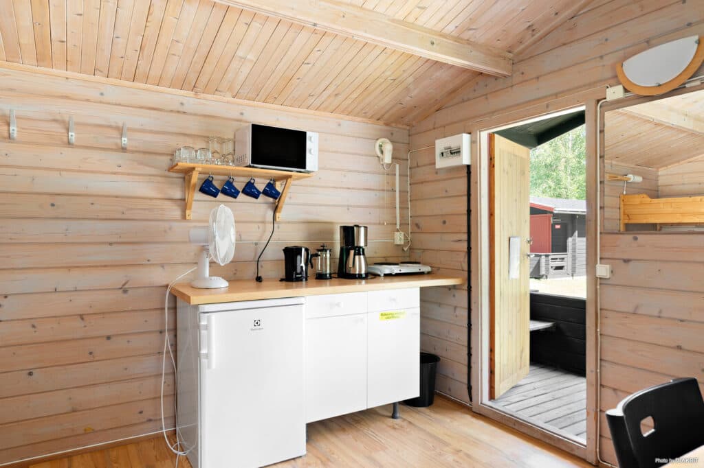 En hjemmekoselig hytte på 16 m² med plass til 5–6 personer. Sengene er plassert i ett soverom med to køyesenger. Merk at det kun er fire faktiske sengeplasser, men den øverste sengen er 80 cm bred og den nederste 120 cm. Hver seng har madrass, dyne og pute. Hytta er innredet med spisebord og stoler. Kjøkkenet har kjøleskap, mikrobølgeovn, to kokeplater, to kjeler samt det viktigste kjøkkenutstyret og servise til seks personer. Det er ikke innlagt vann i hytta, men det finnes vannkanne og oppvaskbalje. Ønsker dere stekepanne, er dere hjertelig velkommen til å låne en i resepsjonen.