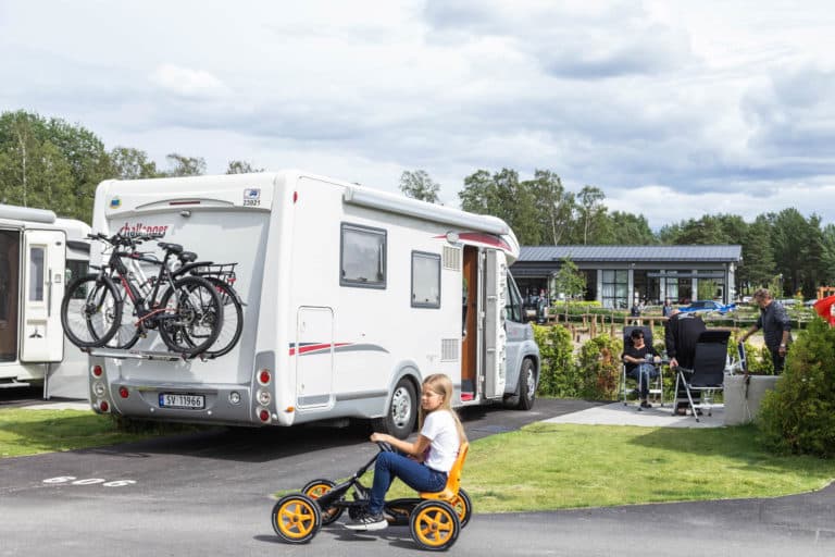 Hvis du besøker oss med bobil, kan du velge om du vil bo på våre bobilplasser eller noen av våre andre fine oppstillingsplasser. Våre bobilplasser med strøm på asfalt har gress og et asfaltert område ved siden av, og er 10 m dype og 8 m brede. Plassene har en fin grønn hekk rundt seg for å ramme inn plassene. Plassene ligger nær inngangen til campingplassen og er i nærheten av hoppeputer, lekeplass, bistro og resepsjon.