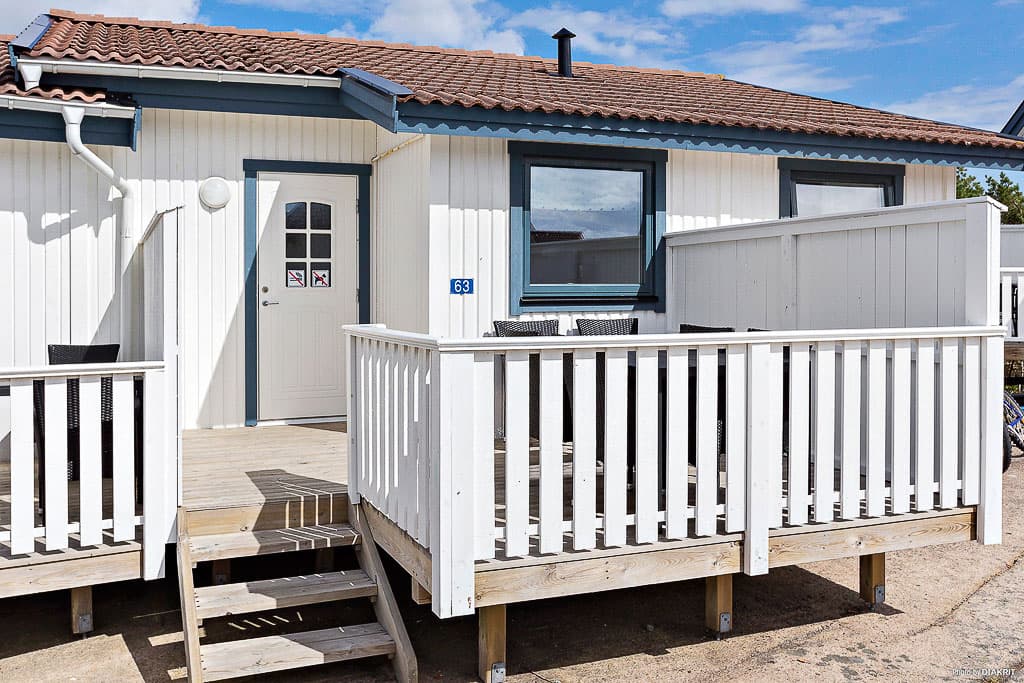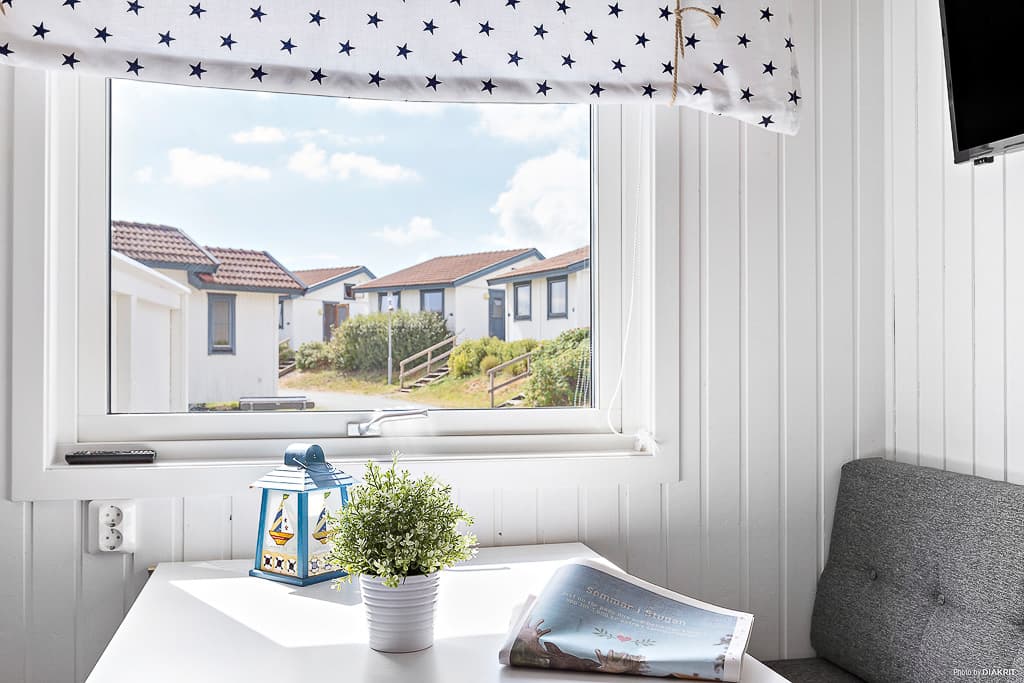 Komfortabel og smakfull overnatting i tomannsbolig. Hytta er på 33 m² og har plass til 6 personer. Etter en dag med sol og bading kan du nyte den varme sommerkvelden i utemøblene på terrassen. Hytta har to rom og en hems med to soveplasser. Soverommet har en dobbeltseng, to lenestoler og en moderne veggmontert TV. På kjøkkenet er det en sovesofa for to personer. Tepper og puter er inkludert til alle senger i hytta. På det fullt utstyrte kjøkkenet finner du kjøleskap, fryser, stekeovn, komfyr og oppvaskmaskin. Badet har dusj og toalett.