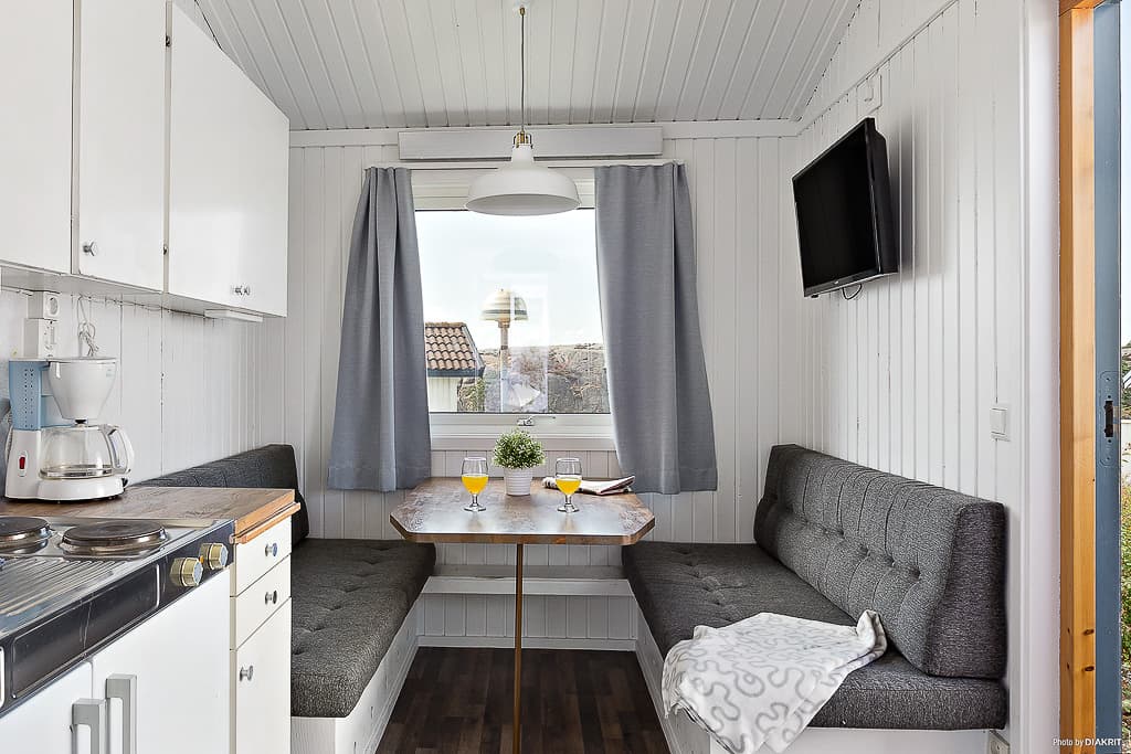 En smakfull innkvartering på 22 kvadratmeter for en liten familie eller vennegjeng, totalt 6 sengeplasser. Disse hyggelige hyttene har et separat soverom med to senger i form av en køyeseng, to senger på hemsen samt et kjøkkenbord og sofa som kan gjøres om til en dobbeltseng om natten. Tepper og puter er tilgjengelige til alle senger i hytta. Utenfor inngangsdøren venter en fin møblert veranda. Den velplanlagte kjøkkenkroken består av kjøleskap med fryseboks, kokeplater og spiseplass for fem personer. Badet er utstyrt med dusj og toalett.