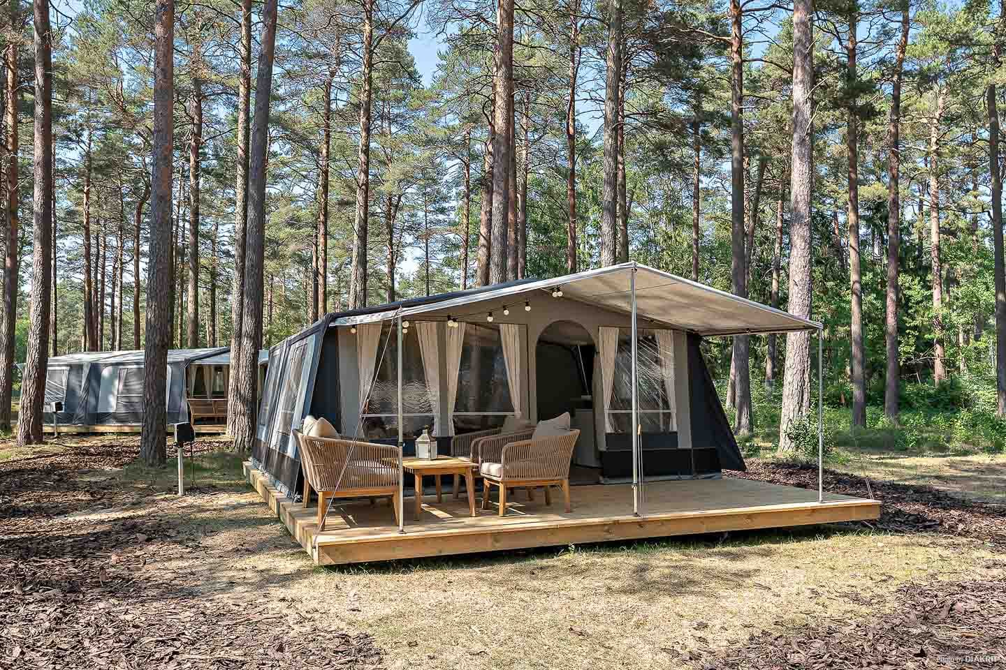 I våre glampingtelt finner du komfortable senger, en liten spiseplass og en hyggelig uteplass. Utstyr som kjøleskap, fryser og kjøkkenutstyr som glass, bestikk og tallerkener kan variere fra destinasjon til destinasjon. Uansett har du alltid gratis tilgang til våre servicebygg der det er dusj, toalett og muligheter for matlaging. Der finnes også rengjøringsutstyr hvis det ikke er inne i glampingteltet, da dette også kan variere fra destinasjon til destinasjon.